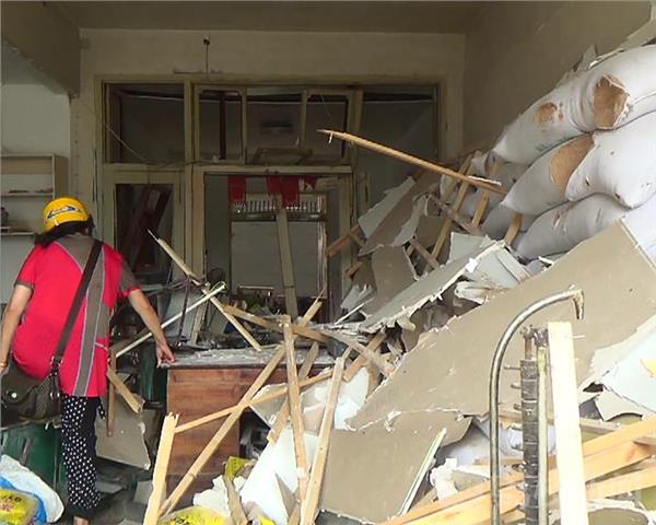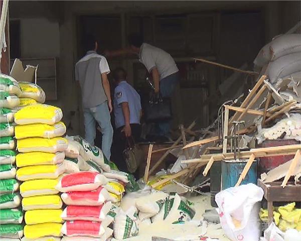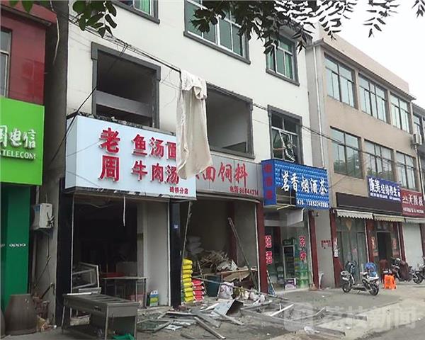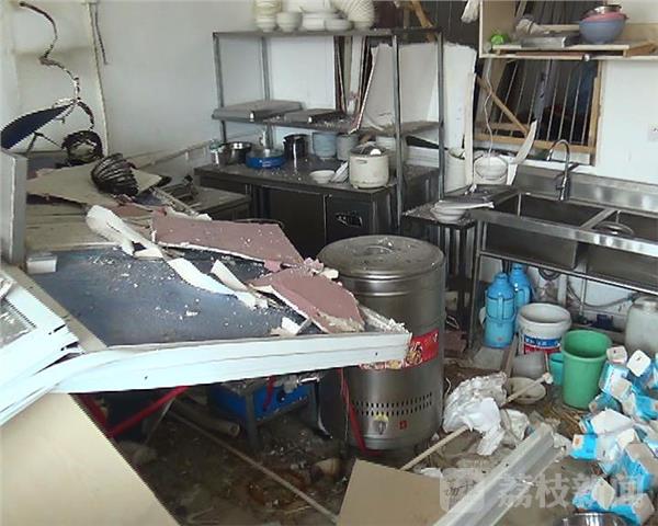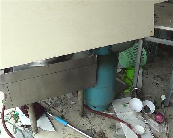 記者現(xiàn)場看到工人正在拆卸樓上被炸碎裂的玻璃窗戶,樓下全是窗戶玻璃碎片,爆炸的牛肉面館和隔壁的房東餃面飼料店里一片狼藉,隔壁移動公司和一個煙酒店玻璃窗戶和門牌也被炸碎裂和損壞。記者進入餃面店發(fā)現(xiàn),里面操作臺旁邊還有煤氣瓶,房頂砸脫落熏黑,房東房間窗戶也被炸彎曲變形,隔壁房東的店鋪里面也是狼藉一片,整袋的米和飼料包裝袋被砸損。大門也被砸壞。